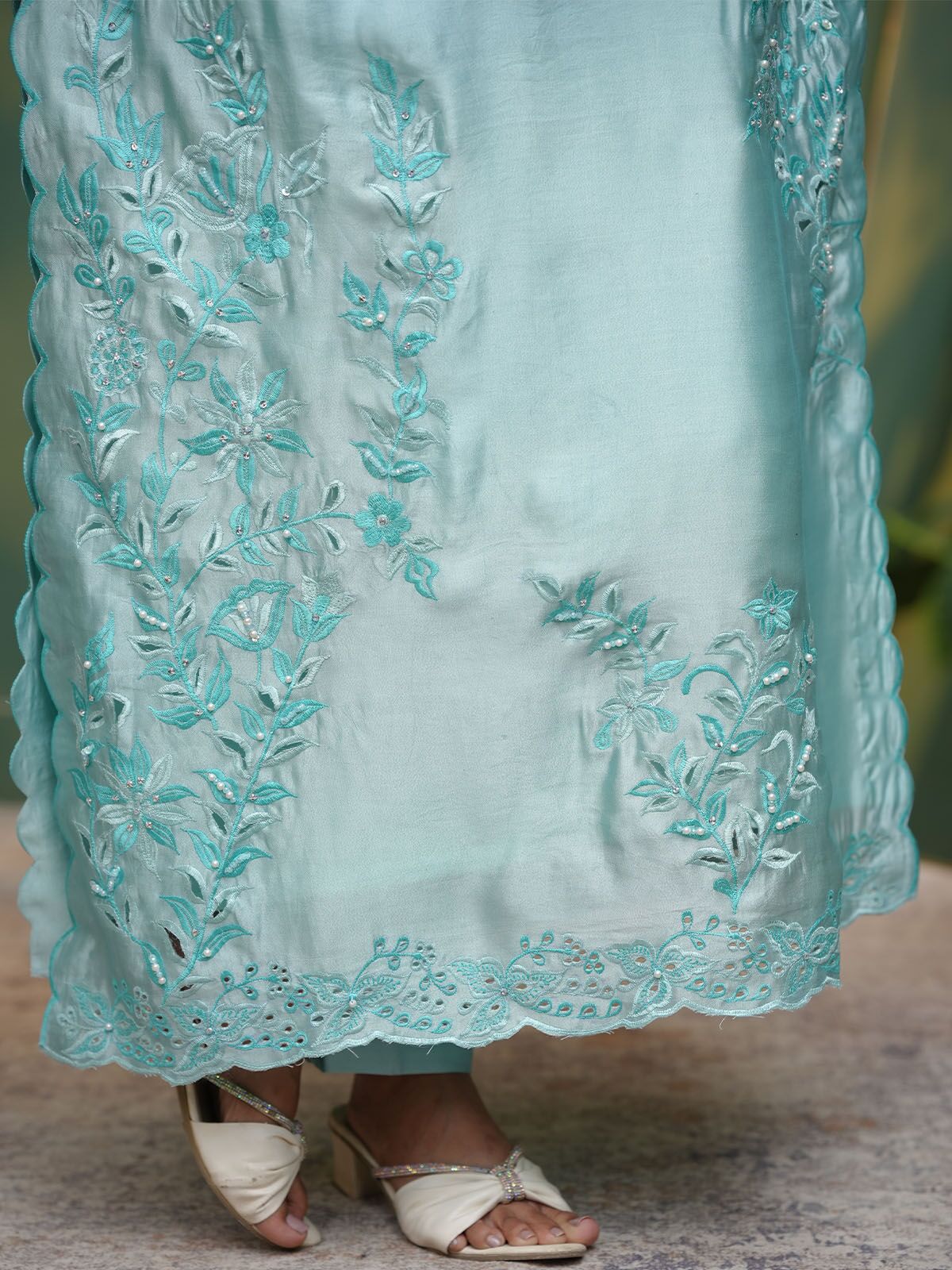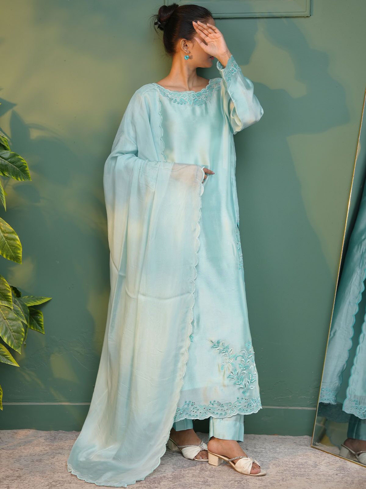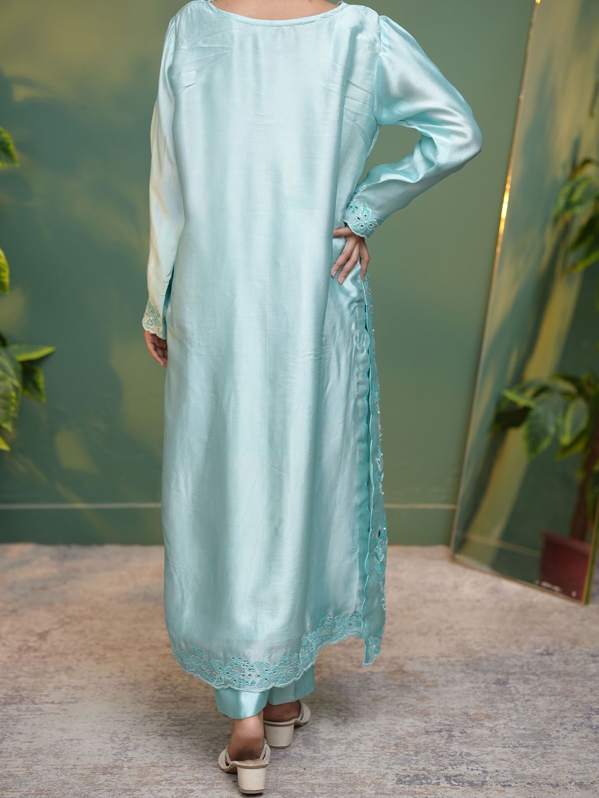 Sky Blue – A graceful expression of festive elegance, Blush Petal is crafted in luxurious pink sheesha silk, designed to flow effortlessly with a soft sheen. The long shirt features delicate embroidery enhanced with cutwork detailing, complemented by subtle handwork accents that add depth and refinement. Paired with matching pants and a silk dupatta finished with scalloped edges, this ensemble embodies understated luxury.