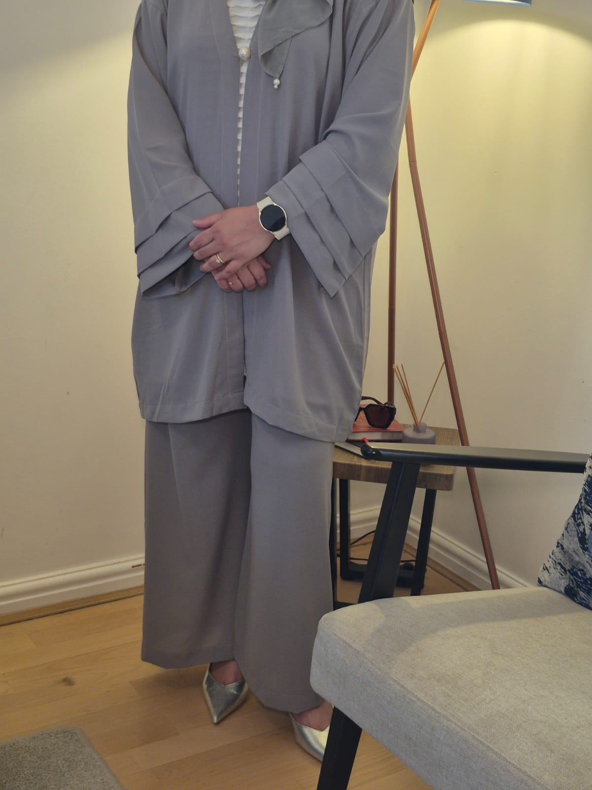 Elevate your wardrobe with this timeless Grey -toned co-ord set, crafted from lightweight, all-season georgette fabric. This sophisticated 4-piece ensemble features a tailored short jacket, flowy straight-cut pants, and a matching hijab for a cohesive look. The standout piece,a beautifully detailed inner ,is enhanced with intricate fabric manipulation, pleated accents, and delicate pearl embellishments for a refined, graceful touch.