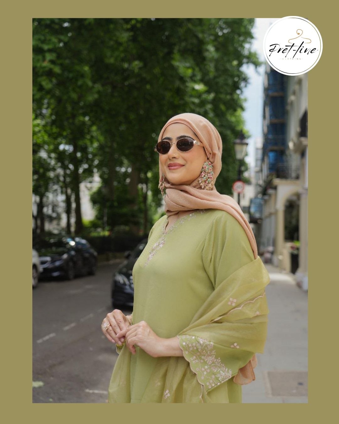 Elegant three-piece suit featuring olive green floral embroidery accented with hints of pink, white, and gold sequins.