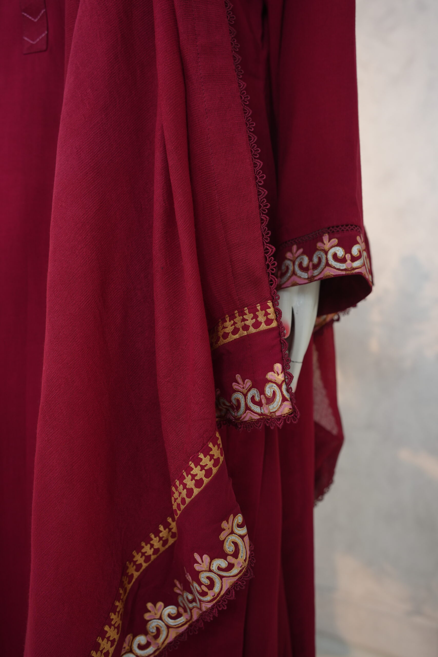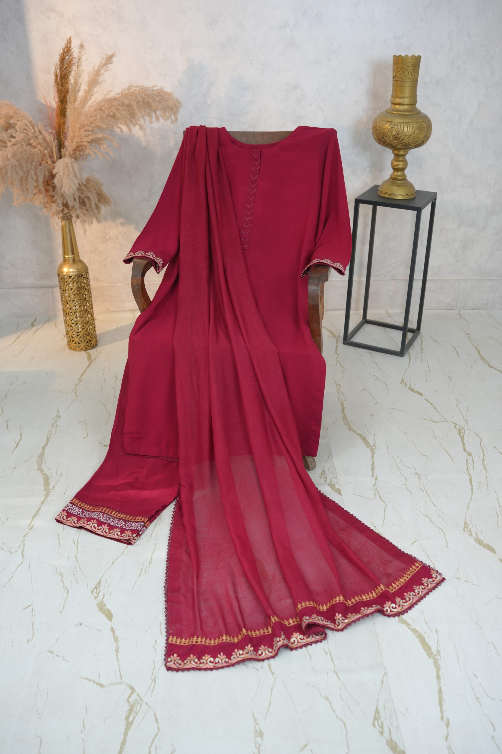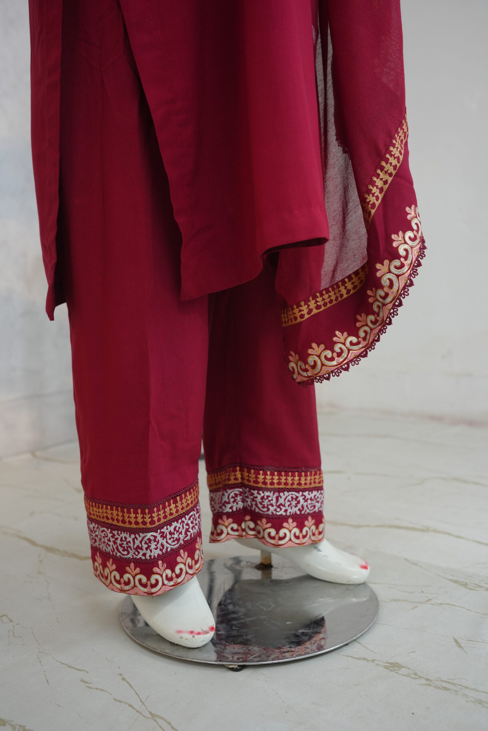 Deep Maroon – A refined 3-piece stitched set in Boski Linen — soft, matte and warm for the winter season. The deep maroon tone is complemented with block print detailing on the sleeves and trouser hem, adding a classic handcrafted touch.