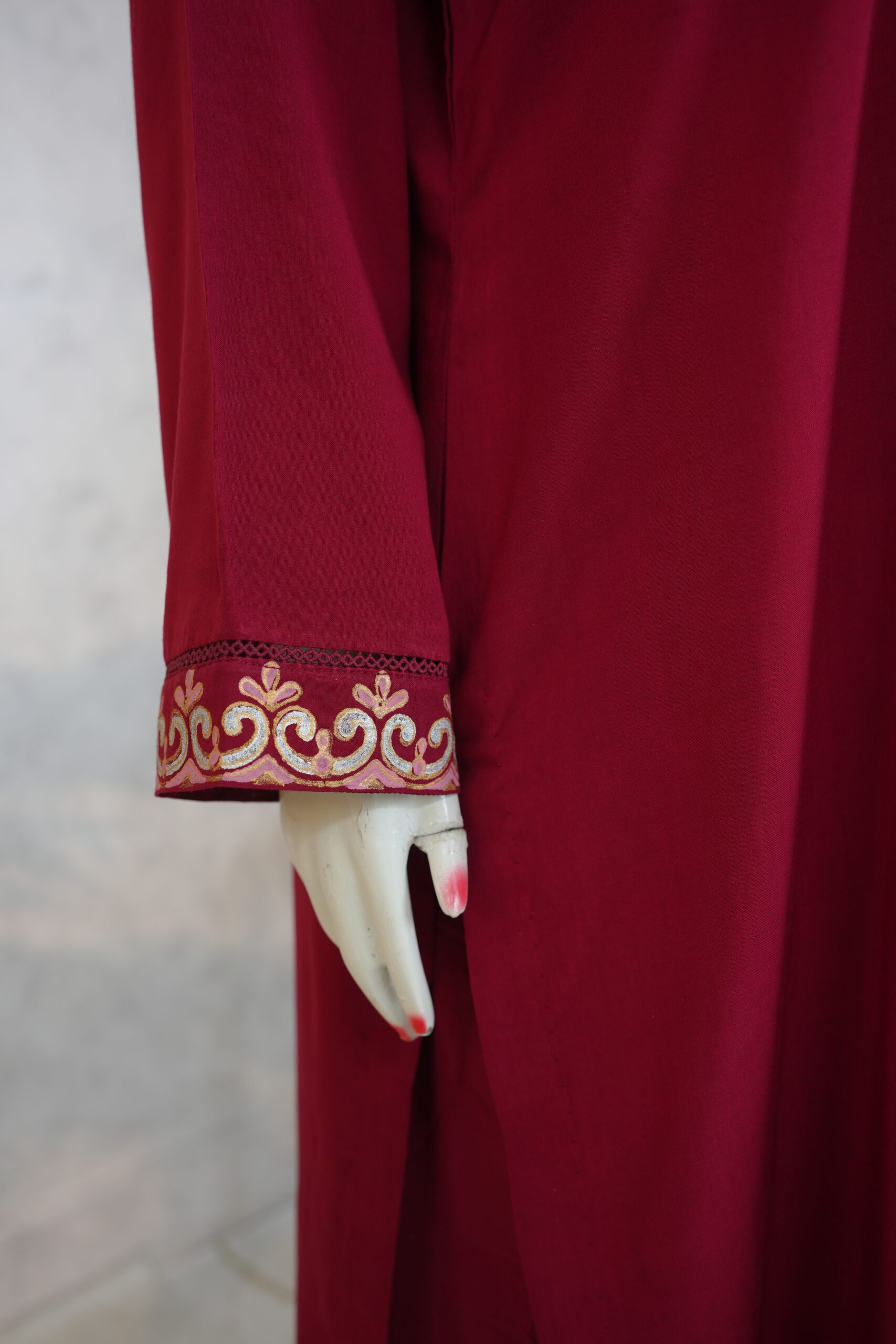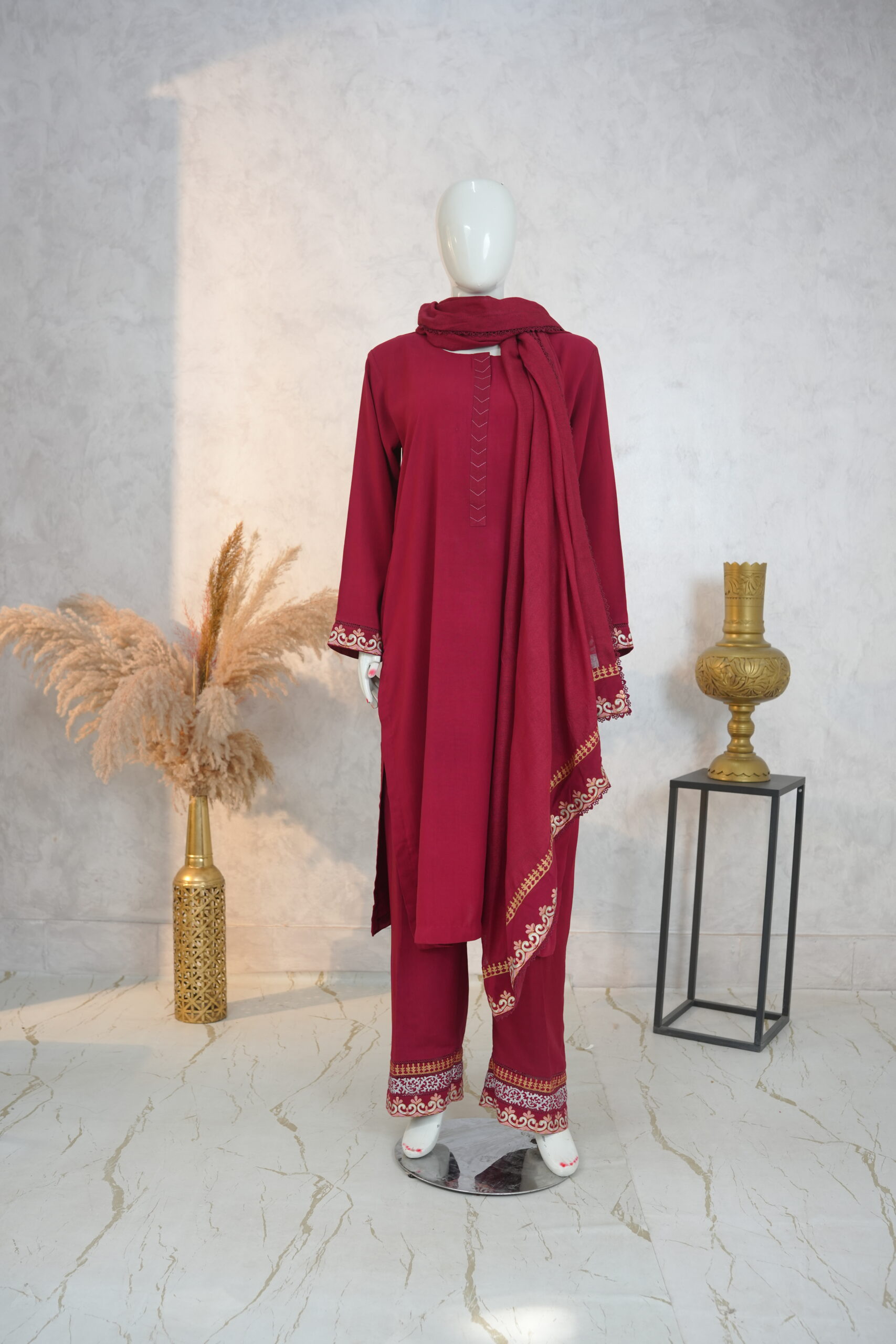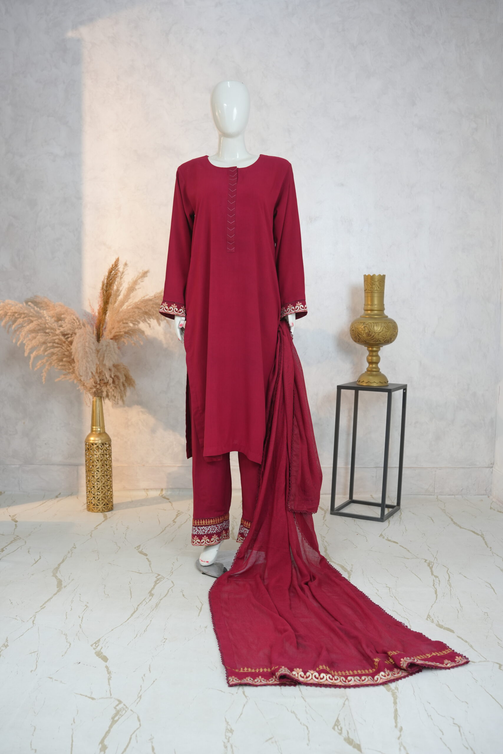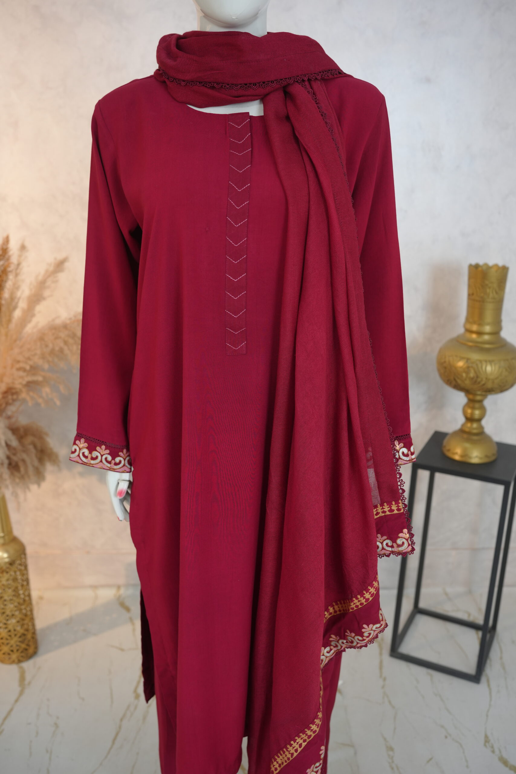 Deep Maroon – A refined 3-piece stitched set in Boski Linen — soft, matte and warm for the winter season. The deep maroon tone is complemented with block print detailing on the sleeves and trouser hem, adding a classic handcrafted touch.