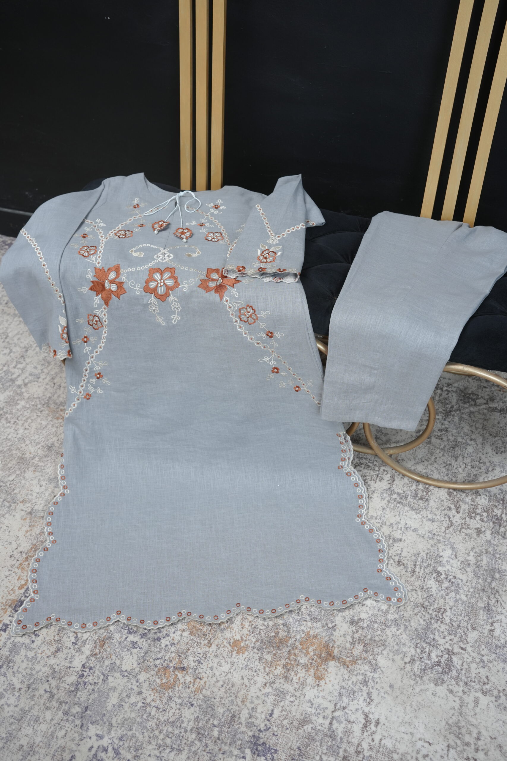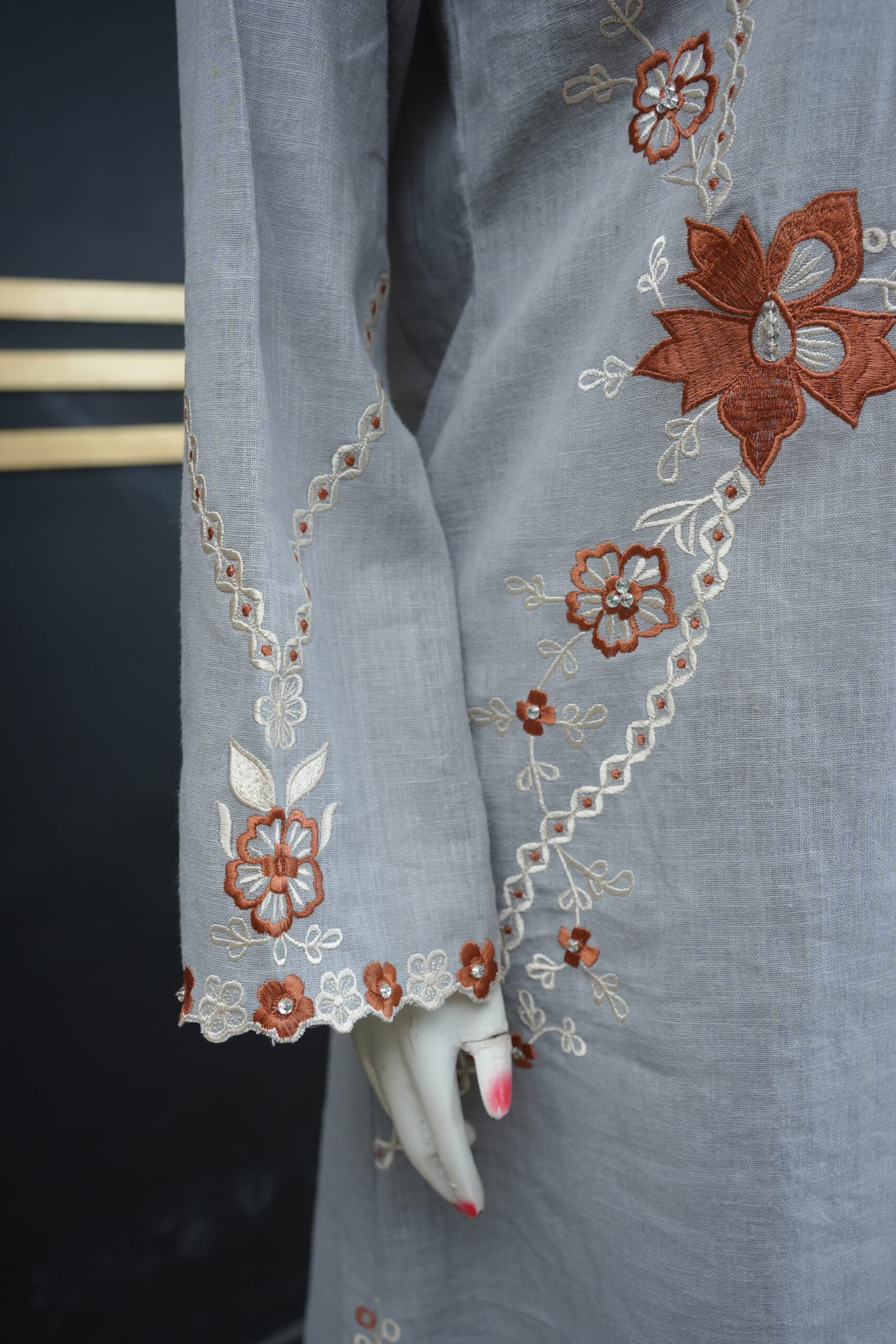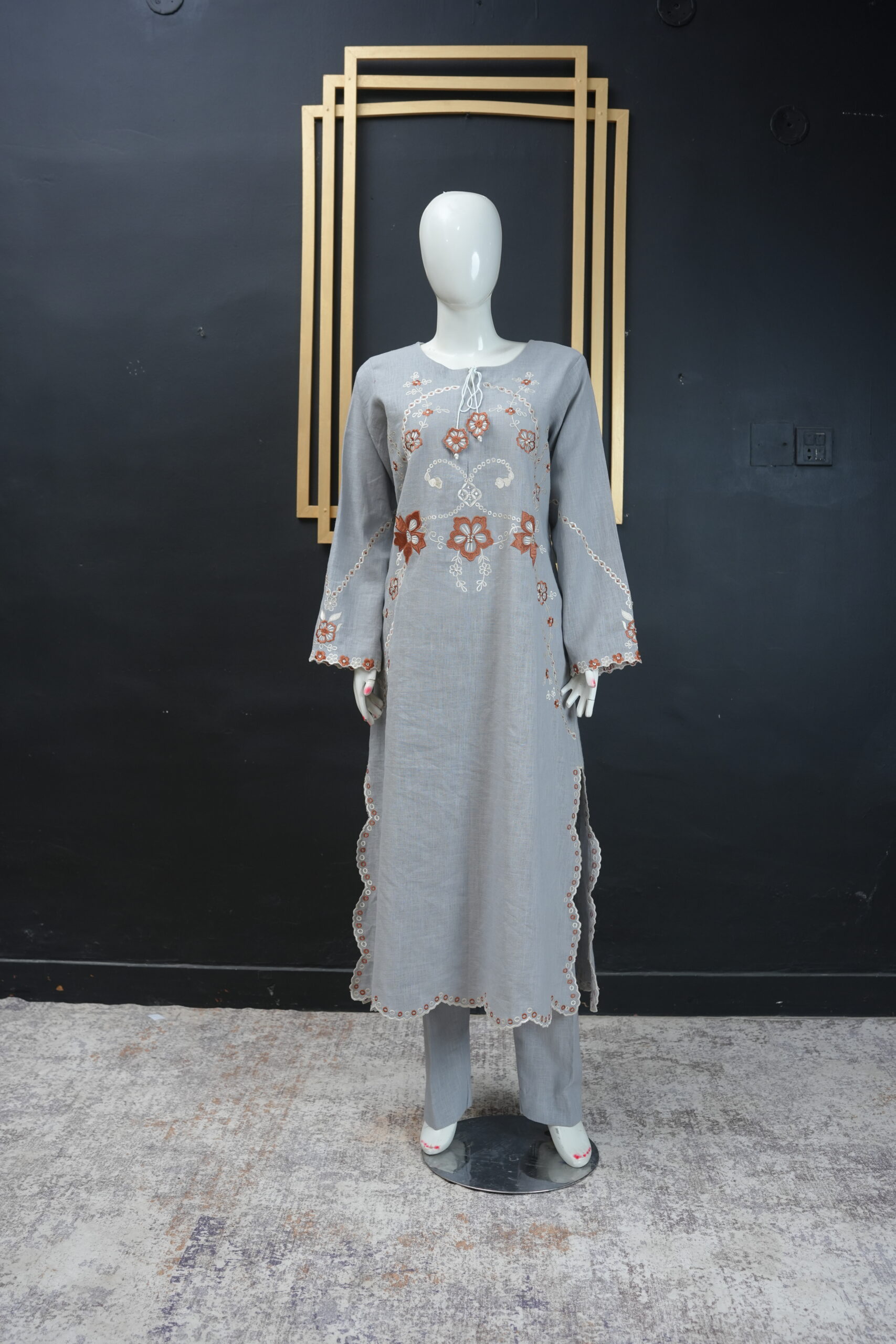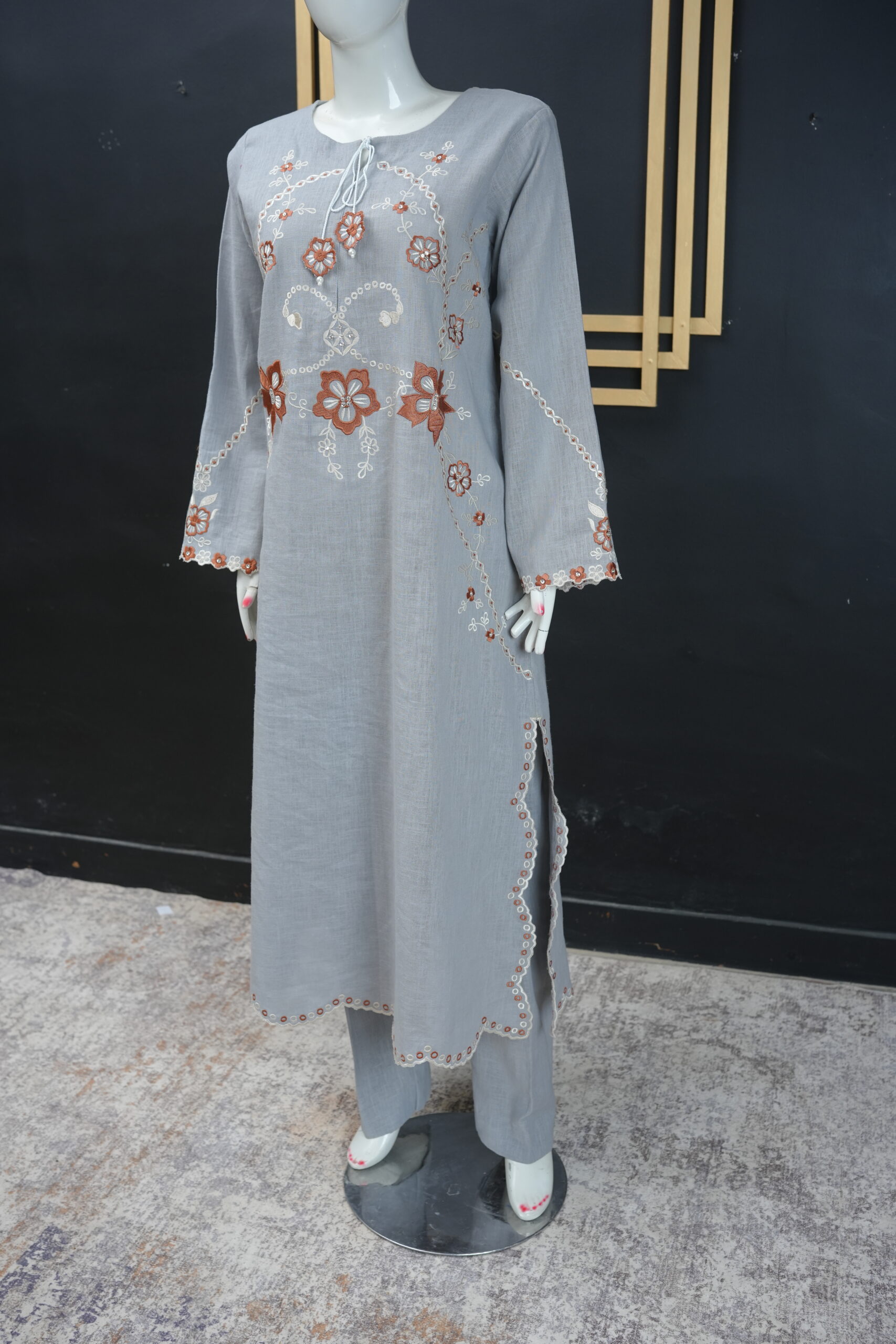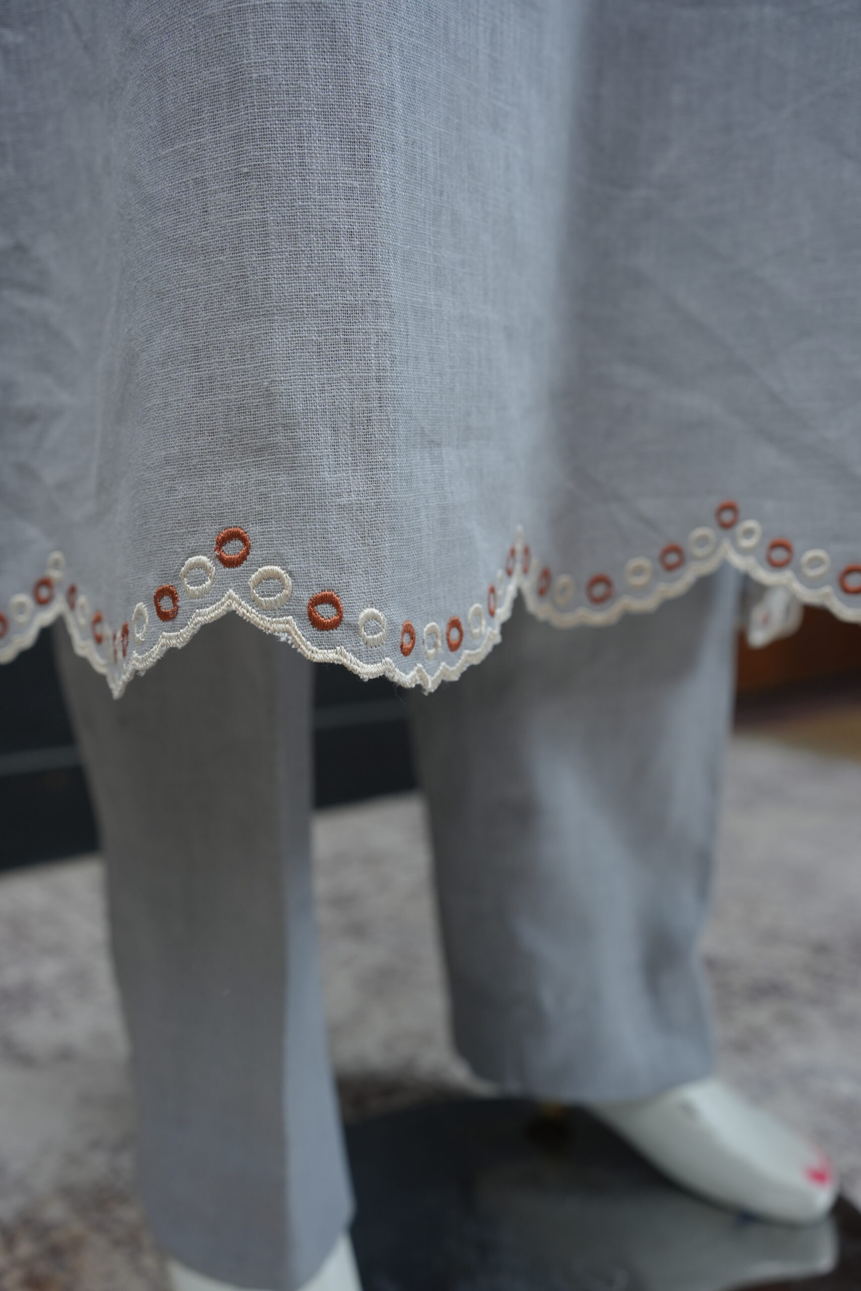 A graceful two-piece long shirt and trouser set in soft Irish Linen, designed