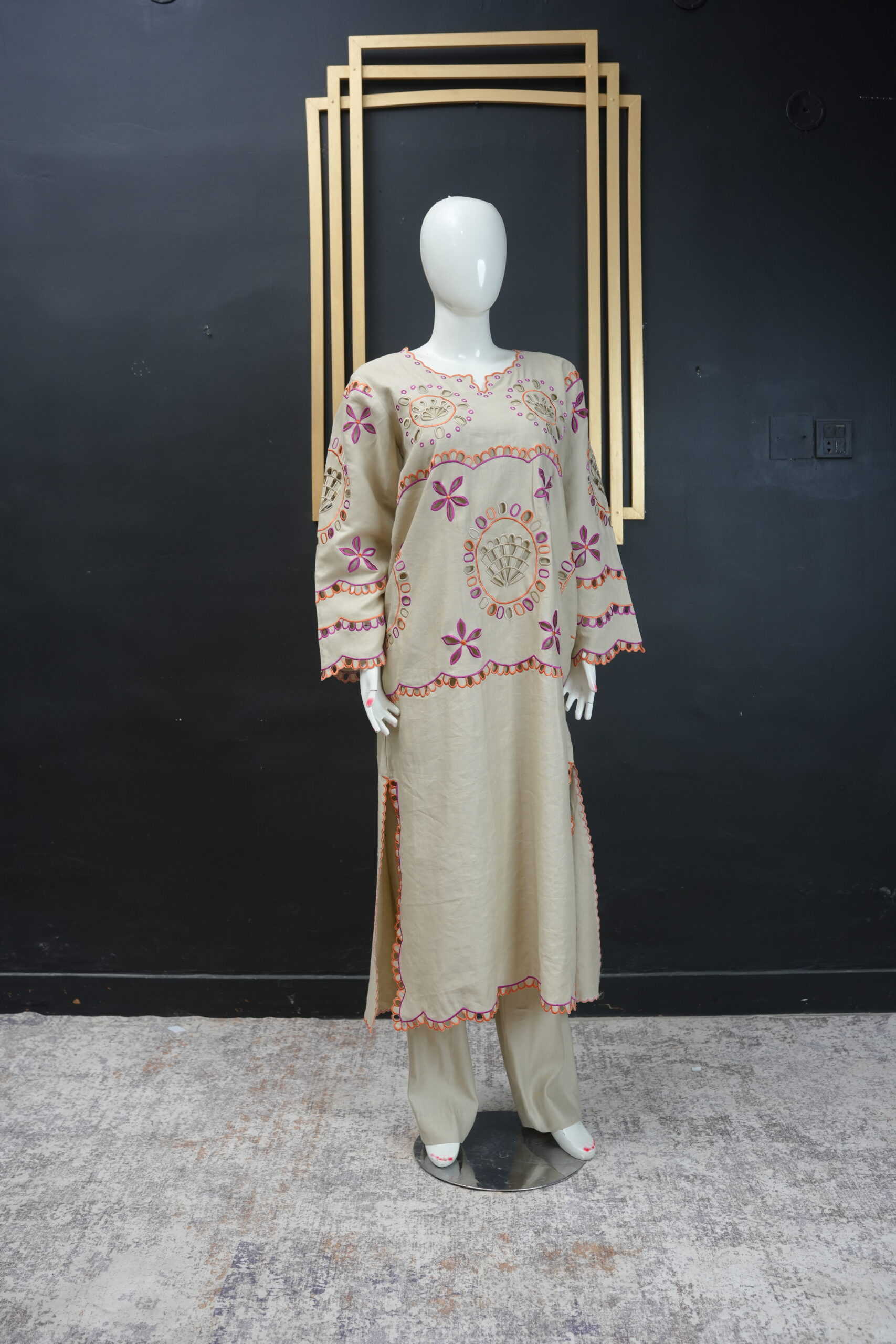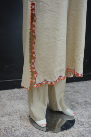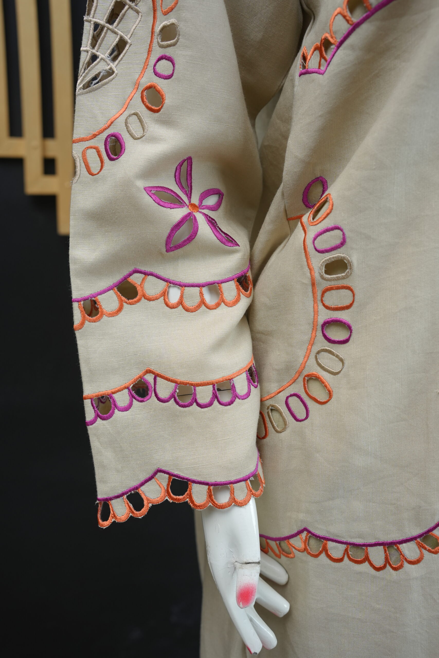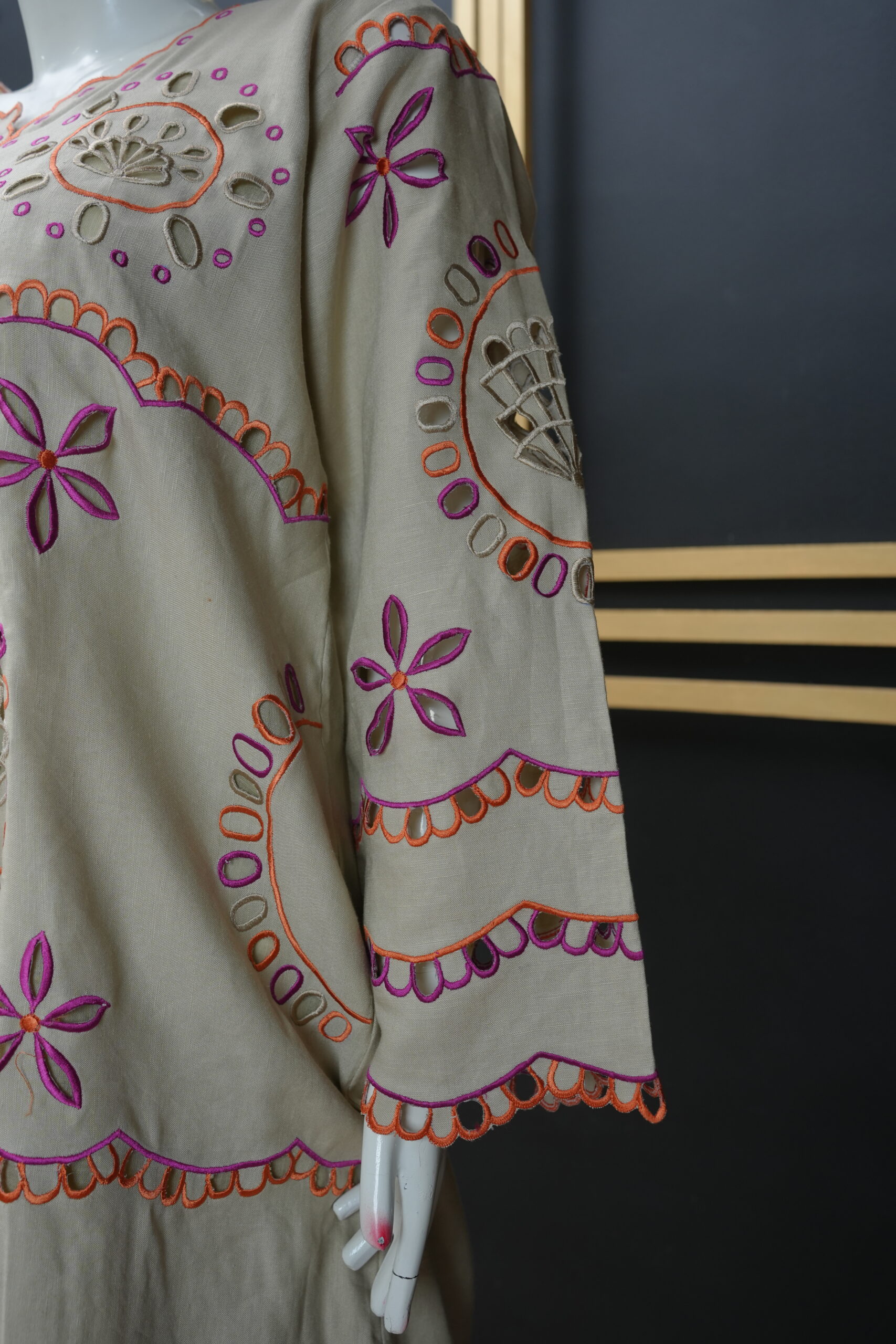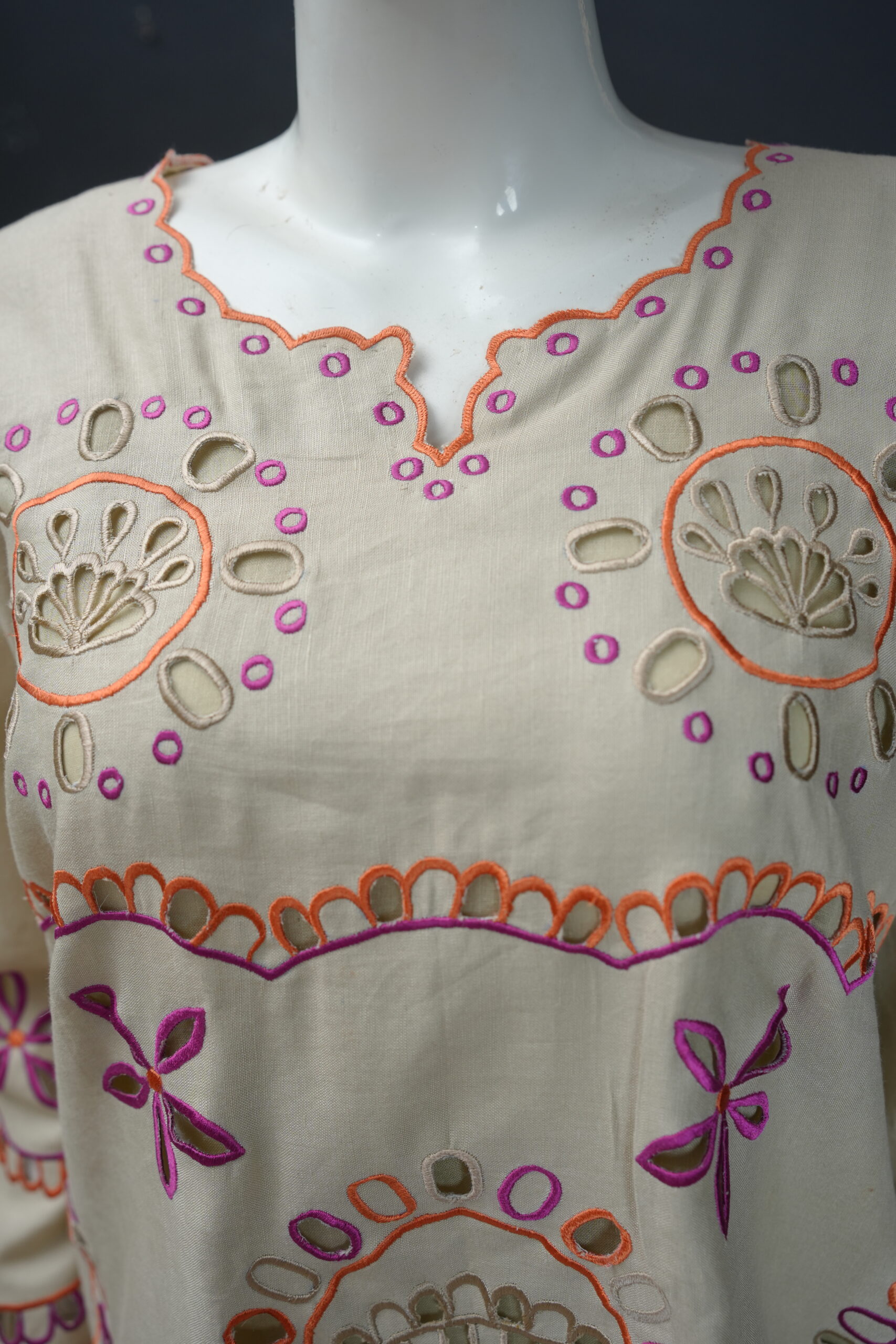 Soft Beige – A beautifully detailed long shirt in premium Irish Cotton — light, breathable, and comfortable for everyday elegance. The soft beige base is enhanced with delicate embroidery and Schiffli cutwork motifs, creating a graceful artisanal look without being loud.